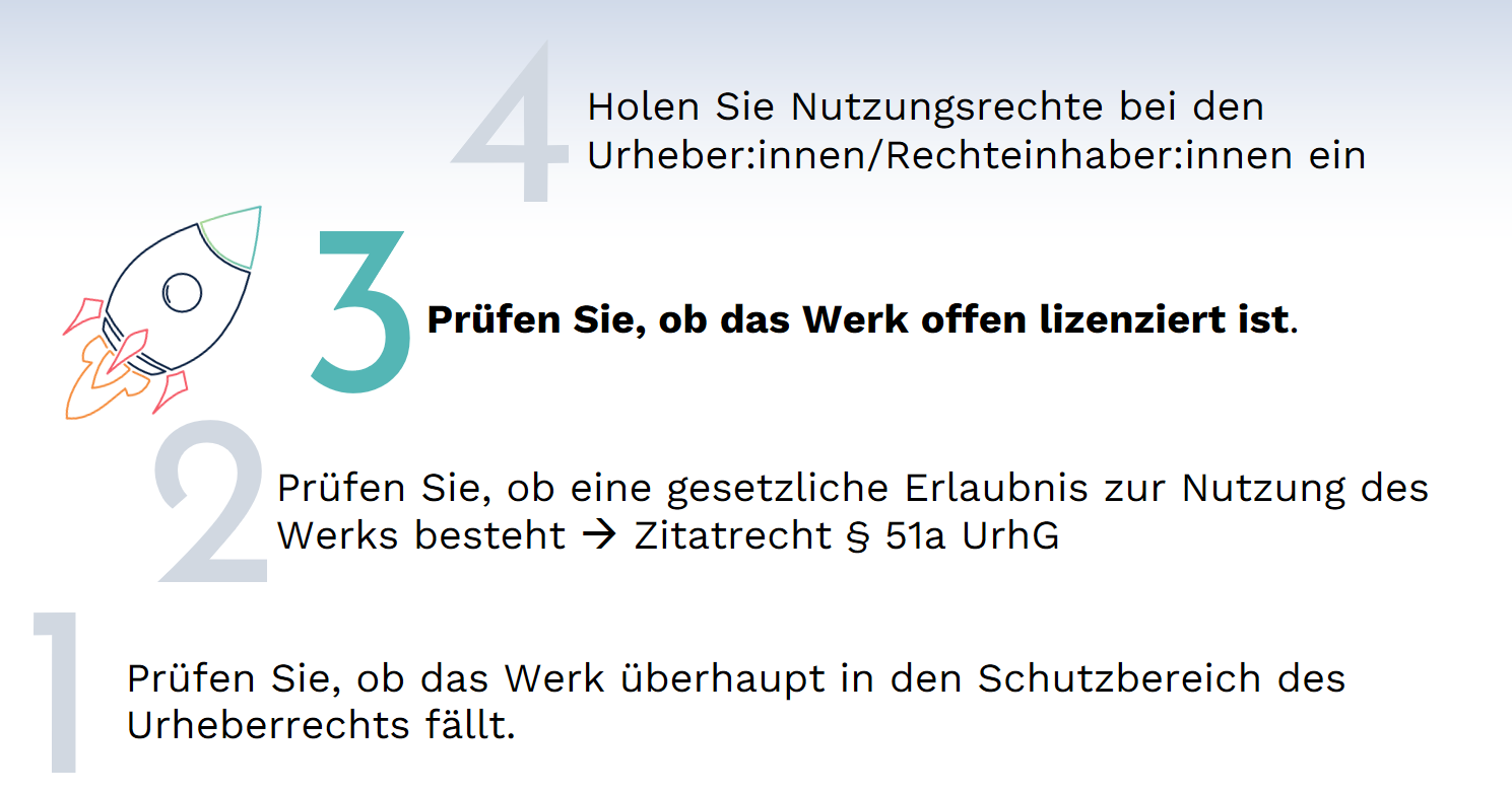 Haben Sie festgestellt, dass das Werk urheberrechtlich geschützt ist und möchten Sie es nicht nur zu Zitatzwecken nutzen - soll der fremde Inhalt bspw. Ihre eigene Ausarbeitung nicht nur belegen, sondern ersetzen, oder möchten Sie das Werk in Gänze nutzen oder bearbeiten - müssen Sie in einem dritten Schritt prüfen, ob das Werk unter einer offenen Lizenz steht. Ist dies der Fall, dürfen Sie es entlang der jeweiligen Lizenzbedingungen verwenden. Um sicher zu gehen, dass die Lizenz die von Ihnen geplante Nutzung erlaubt, sollten Sie den Lizenztext zu Rate ziehen.