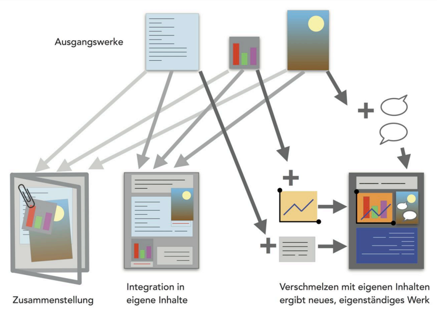Wichtig: Bei der Verwendung CC-lizenzierter Materialien unterscheidet man zwischen Zusammenstellung, Integration und Remix.