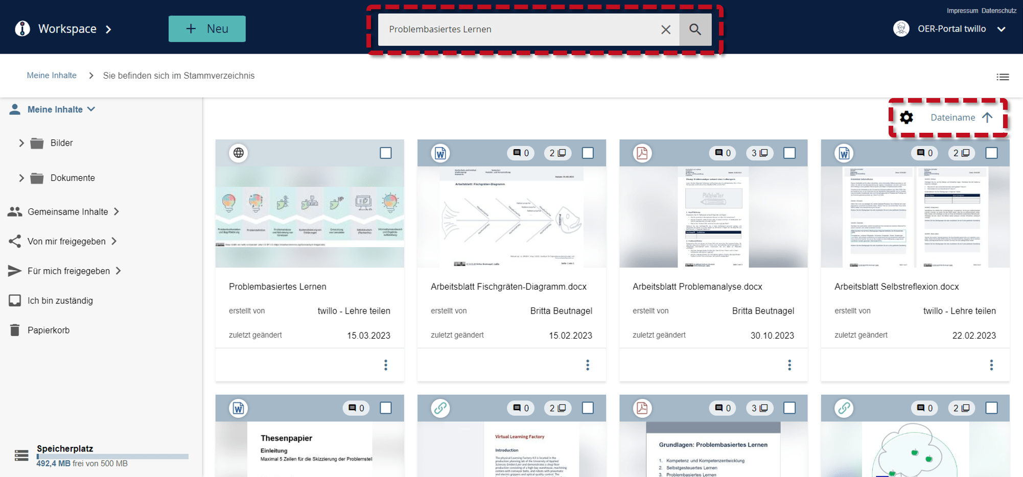 Die Suche innerhalb von twillo steht Ihnen nur nach einem Login zur Verfügung. Nutzen Sie die Suchzeile in Ihrem Workspace, werden Ihnen zu Ihrem Suchbegriff passende Materialien angezeigt, die auf twillo veröffentlicht sind. Über das Zahnradsymbol können Sie wählen, welche Informationen auf den Kacheln der Suchergebnisse angezeigt werden sollen und über einen Klick auf die Option Dateiname können Sie die Sortierung der Ergebnisse einstellen. Für differenzierte Filtermöglichkeiten nutzen Sie bitte die oben beschriebene OERSI-Suche.