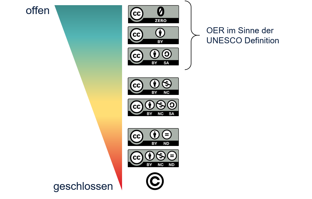 Die Lizenzen CC0, CC BY und CC BY-SA ermöglichen die Verwendung und Bearbeitung von Inhalten zu jeglichen Zwecken und ohne weitreichende Restriktionen. Damit entsprechen sie dem pädagogischen Verständnis von OER - und der in Kapitel 1.1. aufgeführten UNESCO Definition - in besonderem Maße. Auch Materialien, die bspw. nur unverändert eingesetzt und weitergegeben werden dürfen, bieten im Bildungssetting allerdings große Vorteile gegenüber nicht-lizenzierten Materialien, die nur entlang der Schrankenregelungen des Urheberrechts verwendet werden dürfen. Aus diesem Grund fassen wir im Rahmen dieses Bildungsangebots den Begriff OER weiter und schließen alle Materialien ein, die unter einer Creative Commons (oder ähnlichen) Lizenz stehen. |