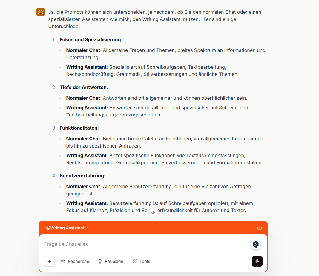 Neben den Standard-Chatbots wie ChatGPT gibt es inzwischen viele CustomGPTs – also individuell erstellte Chatbots, die auf bestimmte Aufgaben spezialisiert sind (z. B. Rollen wie "Writing Assistant" oder "Storyboard-Coach"). In der GPT-Bibliothek findest du viele nützliche Vorlagen.  Auch bei Mistral Le Chat lassen sich eigene Agenten konfigurieren, die ähnlich funktionieren und für spezifische Aufgaben trainiert werden können. Hier am Beispiel des "Writing Assistant":