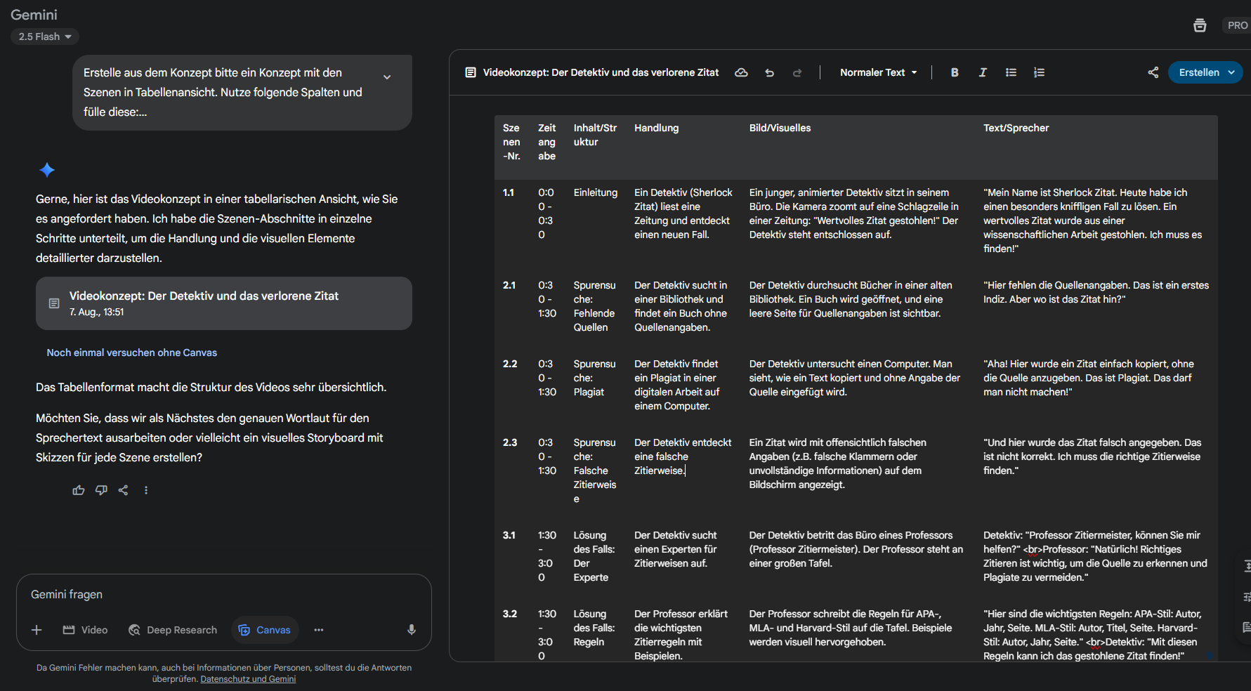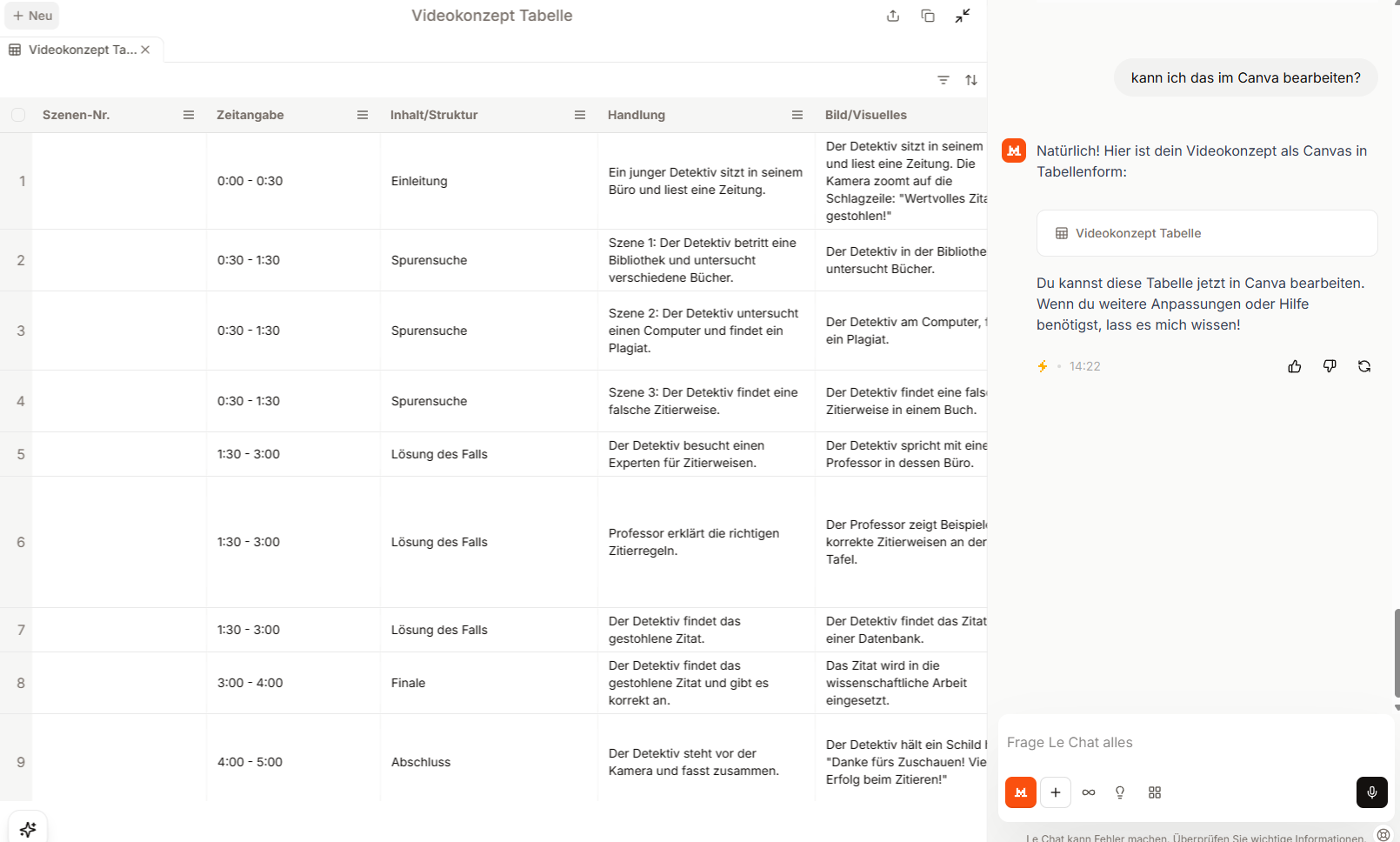 Beispielhaft wurde ein Konzept mit Gemini, Mistral Le Chat (aus Frankreich, datenschutzkonform, mit Canvas-Funktion) und Lumo (aus der Schweiz) erstellt. Ziel war ein Erklärvideo, das das Thema "richtig Zitieren" für Schüler*innen spannend und anfängerfreundlich vermittelt. Als Grundidee zur Umsetzung wurde eine Detektivgeschichte gewählt.
