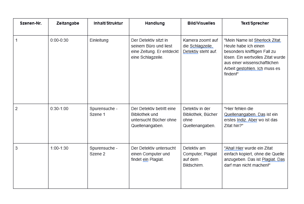 Am Ende kannst du die KI bitten, die Szenen in einer tabellarischen Struktur auszugeben, z. B. mit folgenden Spalten: