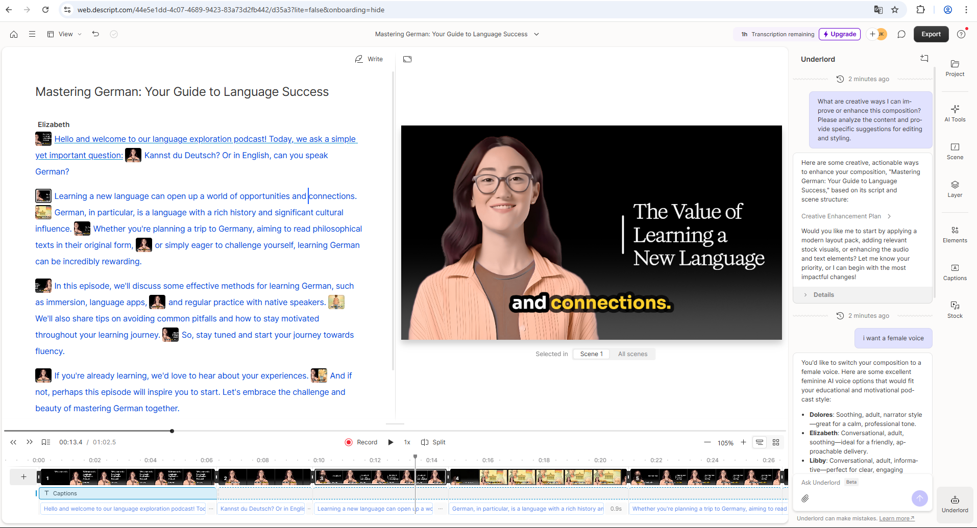 Beispiel: Descript Video-Editor mit einer generierten Avatar und passendem Skript