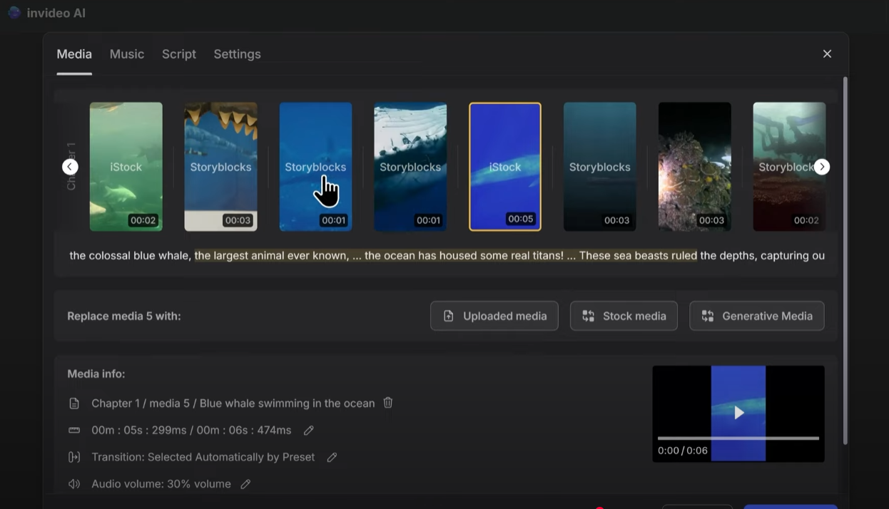 Sollten einzelne Aufnahmen nicht zu deiner Vorstellung passen, können sie unkompliziert ersetzt werden – bei InVideo.ai z. B. durch direkten Austausch, Upload oder eine neue Eingabe per Prompt. Allerdings kann die Darstellung und Bearbeitung je nach Projektumfang etwas unübersichtlich werden.