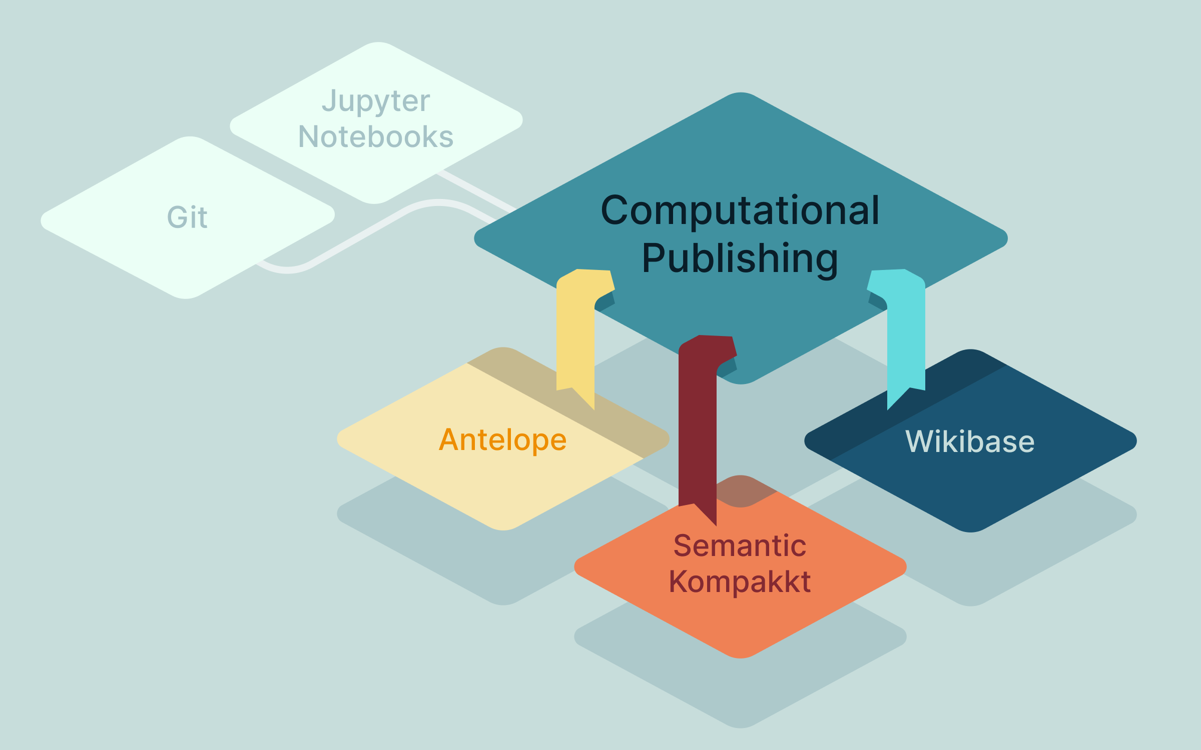 The core pipeline uses Wikibase4Research for LOD storage, Jupyter Notebooks for authoring, a render engine for multi-format outputs, and Git for publication storage. Antelope and Semantic Kompakkt have pipeline integration options.